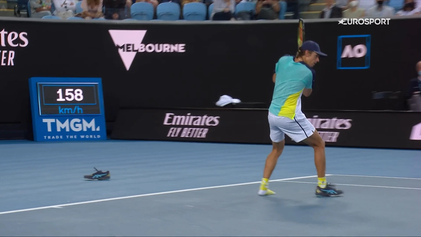 Во втором сете при счете 15:40, 4:2 австралиец скользил по корту, и у него слетела кроссовка.
