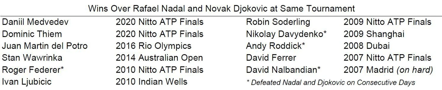 Алькарас стал 12-м теннисистом, обыгравшим на одном турнире и Джоковича, и Рафаэля Надаля. Однако ранее это происходило только на харде. Отметим, что Алькарас самый молодой в этом списке.