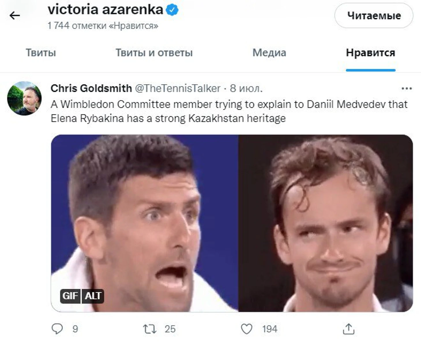 Двукратная чемпионка «Больших шлемов» Виктория Азаренко лайкнула твит на тему отстранения россиян и белорусов от «Уимблдона», опубликованный перед женским финалом.