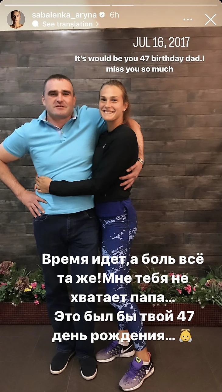 Первая ракетка мира Арина Соболенко выложила сторис о своем отце Сергее.