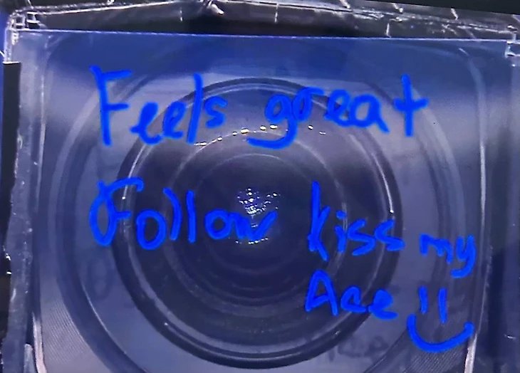 Оставляя автограф на камере, она написала: «Прекрасное чувство. Подписывайтесь на Kiss My Ace».