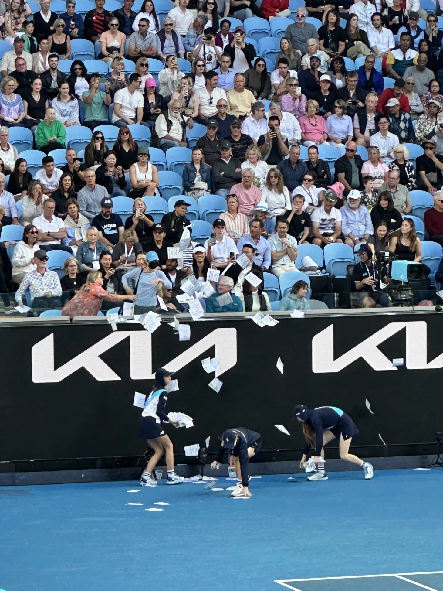 При счете 7:5, 3:6, 4:1 в пользу немца одна из болельщиц выбросила на корт листовки с надписью «Свободу Палестине».