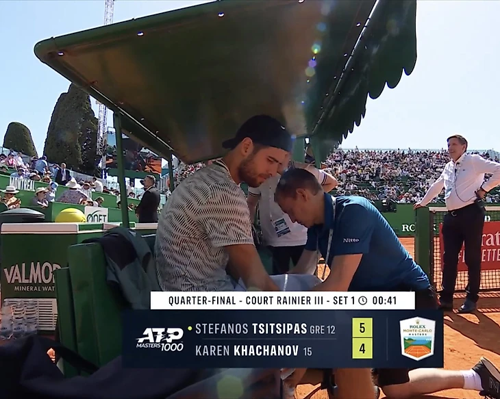 Карен Хачанов в четвертьфинале «Мастерса» в Монте-Карло играет со Стефаносом Циципасом. По ходу первого сета россиянин взял медицинский перерыв.