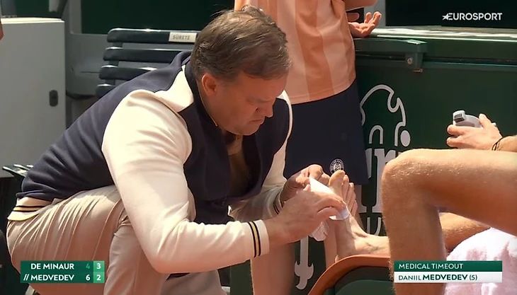При счете 6:4, 2:3 Медведев взял медицинский перерыв из-за мозолей на правой ноге.