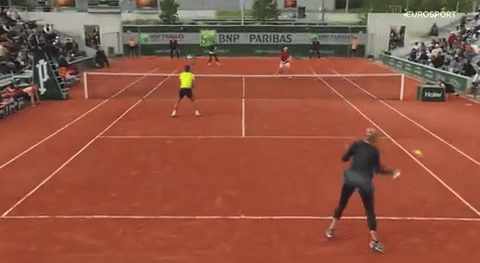 Махач после удара картинно упал на корт и потом поднялся с улыбкой.