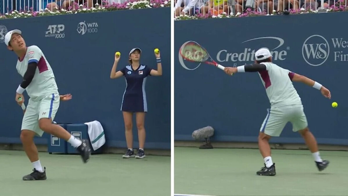 Судья Орели Торт оштрафовала Йошихито Нишиоку на гейм по ходу второго круга «Мастерса» в Цинциннати против Хуберта Хуркача (6:3, 6:7(4), 1:6).