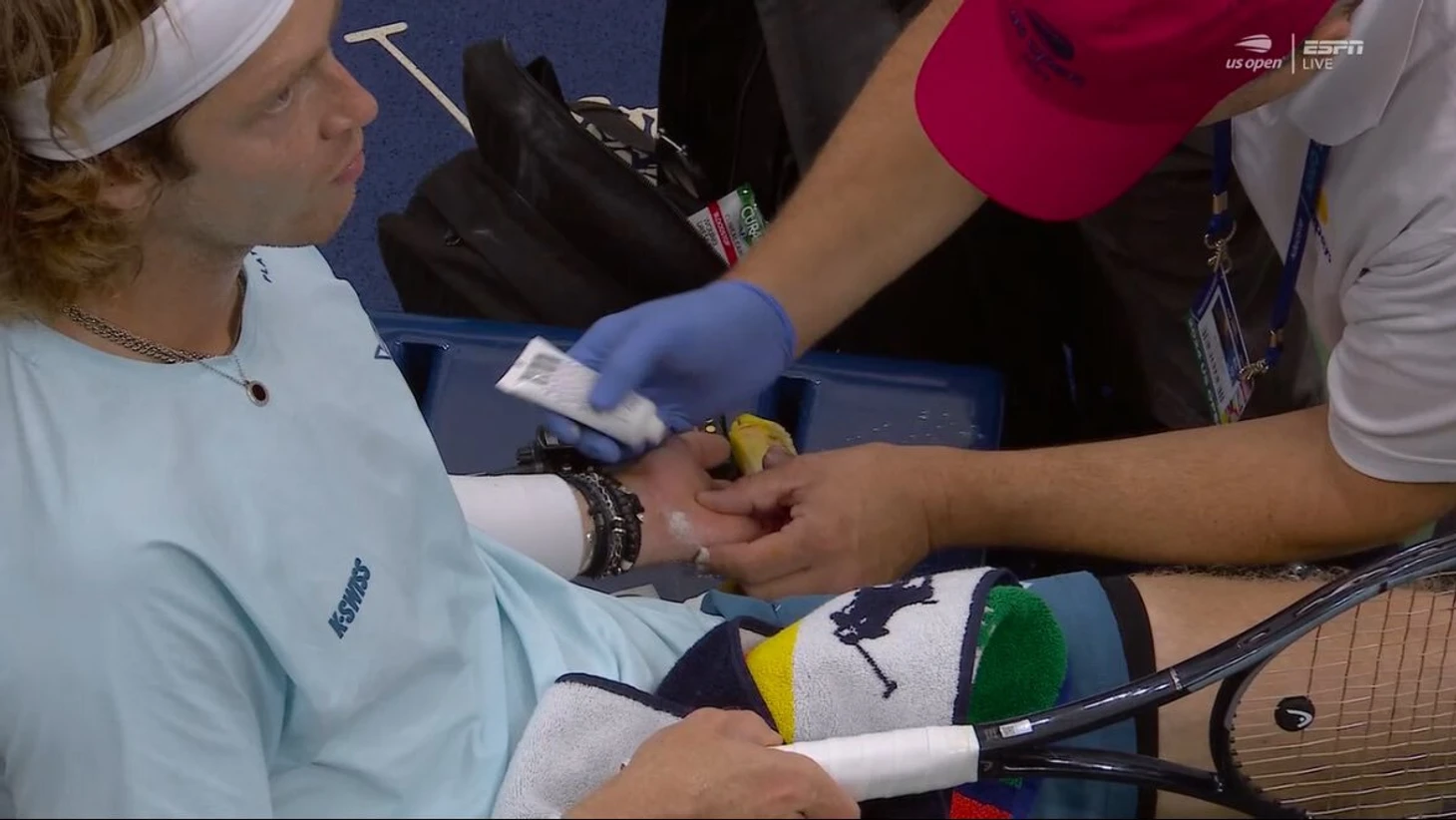 Андрей Рублев взял медицинский перерыв в четвертом круге US Open против Григора Димитрова.
