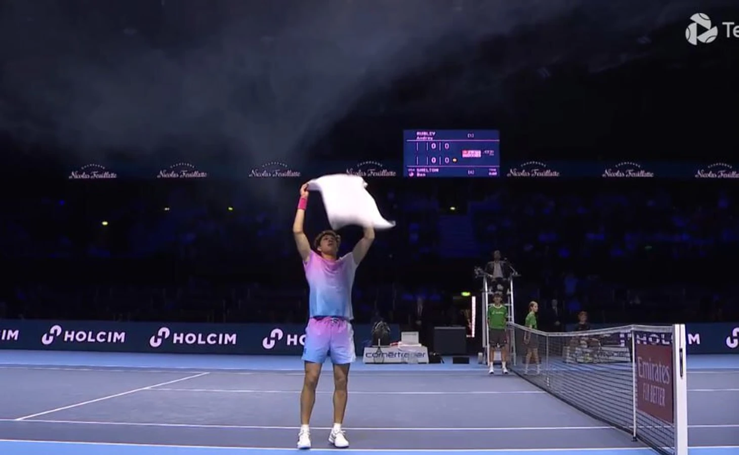 Начало матча Рублева и Шелтона задержалось из-за дымовой машины. Шелтон разгонял дым полотенцем