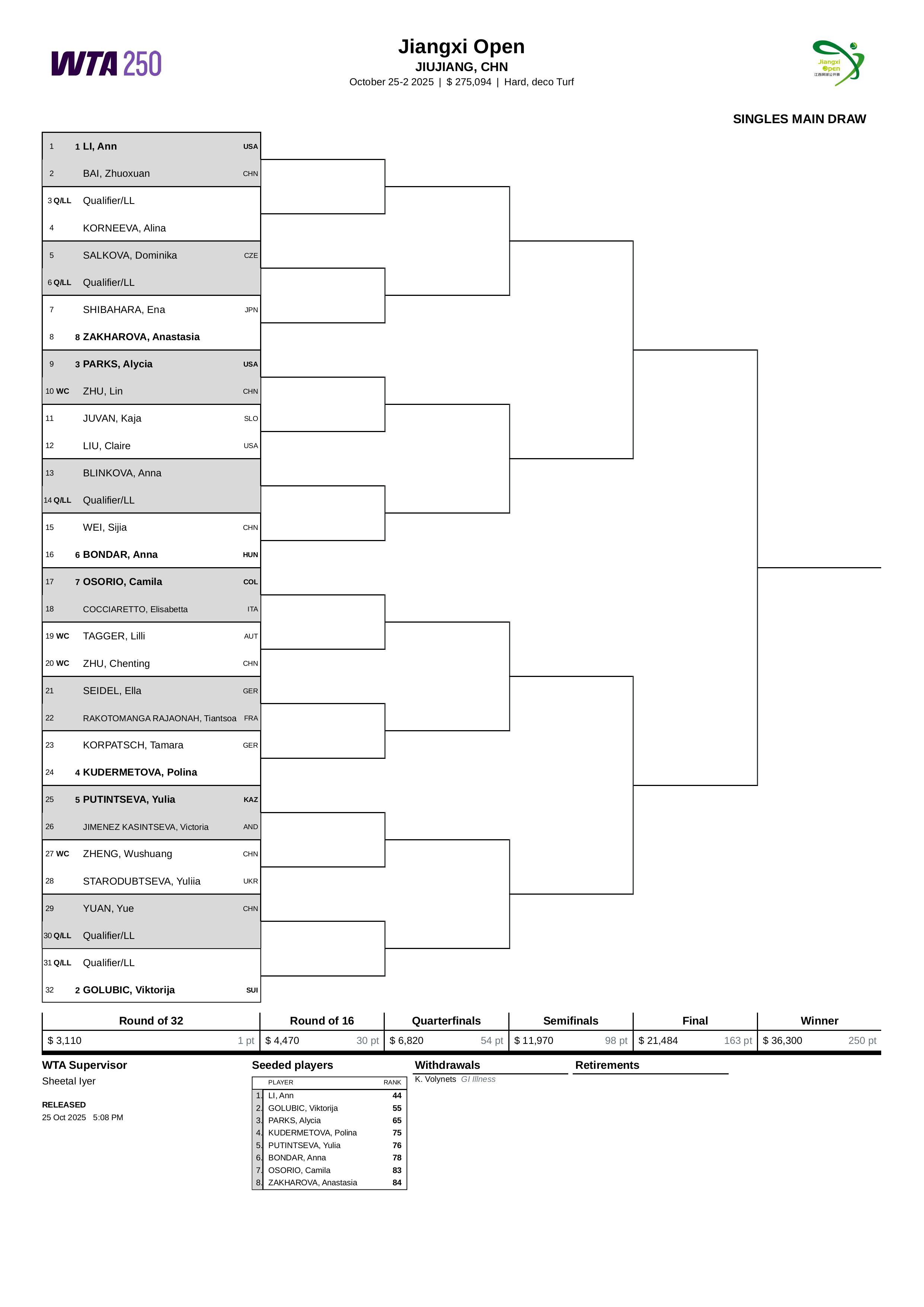 Состоялась жеребьевка WTA 250 в Цзюцзяне.