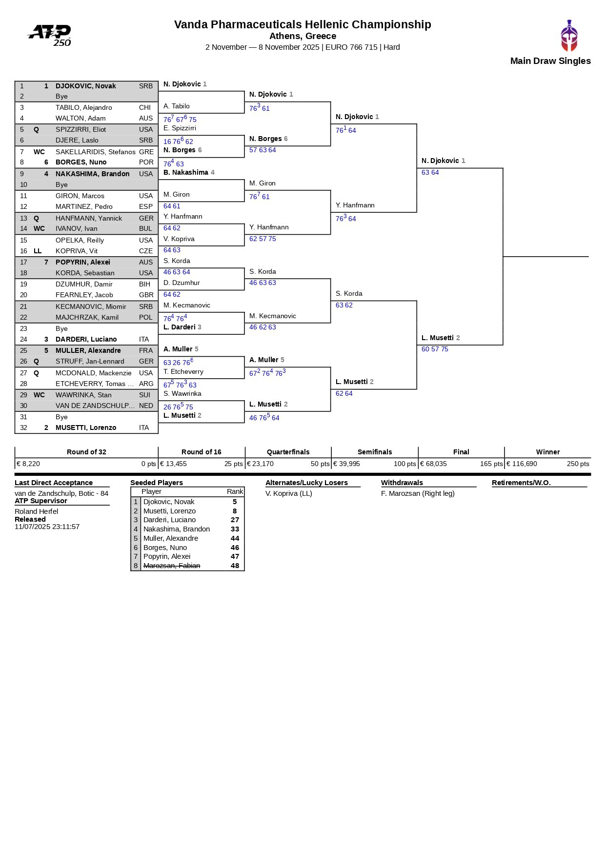 Новак Джокович и Лоренцо Музетти разыграют титул турнира в Афинах.