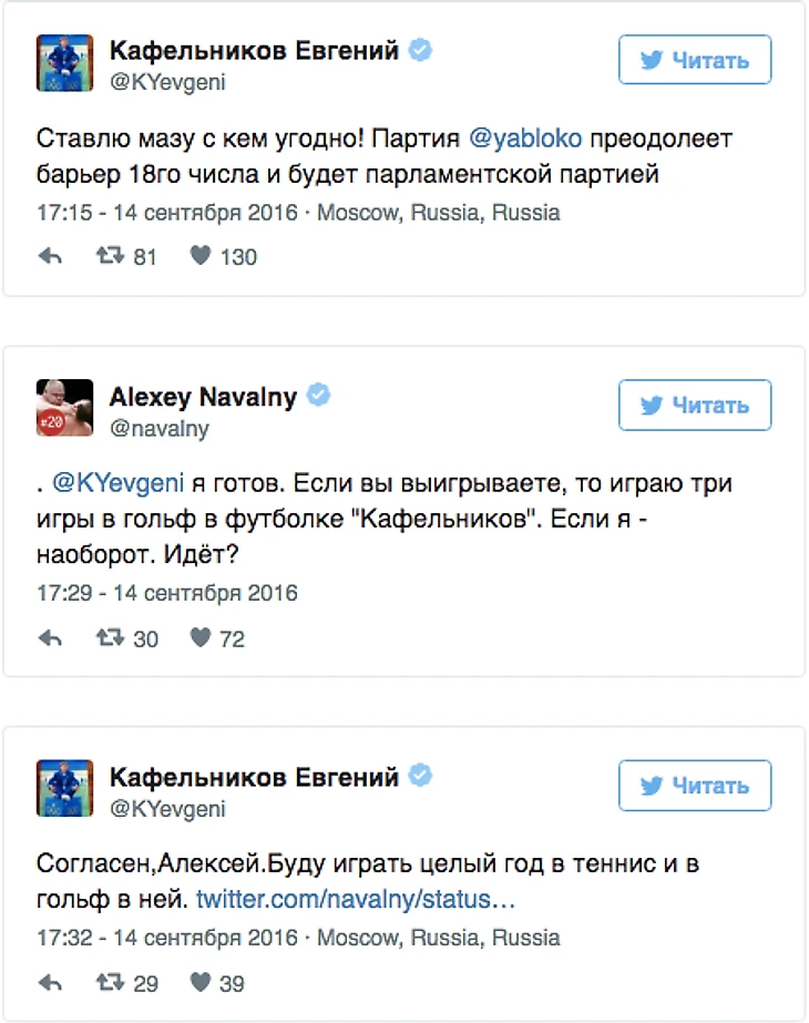 «Яблоку», однако, этой поддержки не хватило, чтобы получить хотя бы один мандат или набрать 3% для получения финансирования. Главным бенефициаром включения Кафельникова в политические процессы стал Алексей Навальный, представляющий незарегистрированную Партию Прогресса.