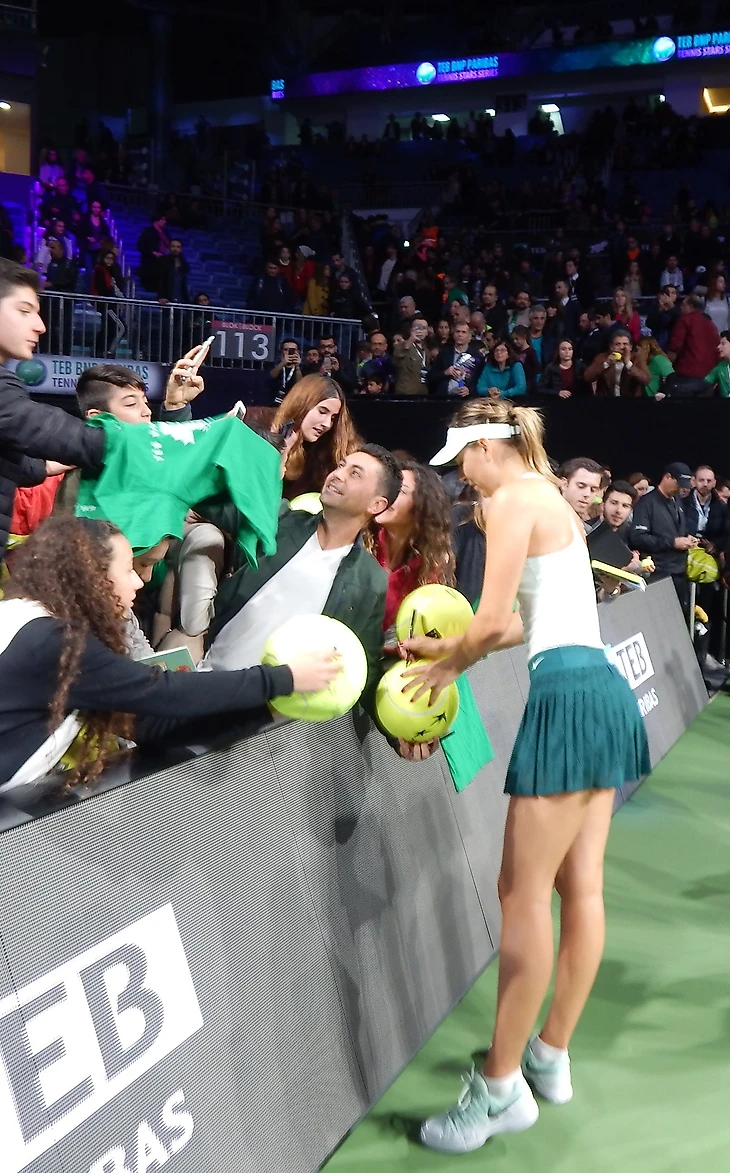 Я просто знаю, что на нее обижаются за то, что в Москве раз за разом всё идет не так гладко, но многое зависит не от нее, а от организаторов. Когда мы дарили ей корзину цветов в феврале 2016-го (здесь в блоге есть записи об этом), я пришла разведать место для съемки автограф-сессии и спросила "А где заграждения?". "Какие заграждения?" — спросили меня удивленно. "Ребята. Здесь на трибунах четыре тысячи человек. И они сейчас ВСЕ придут сюда". "ОЙ!" — и сотрудники стали шустро организовывать металлические "коридорчики" вокруг будки Sugarpova. И в феврале никто не остался без автографа и фото, хотя очередь была немаленькая. И она приносит с собой стопку открыток, для тех, у кого нет чего-то с ее изображением. А в Стамбуле и вовсе свой, блин, маркер!