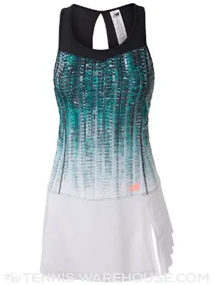 Зеленая печать ombre хорошо сбалансирована с черными и белыми блоками, а розовый логотип NB на левом бедре добавляет пикантности.