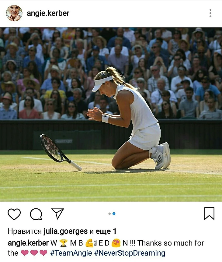 30-летняя немка, в 2016-м победившая на Australian Open и US Open, выиграла 12-й титул в карьере и второй в сезоне, а также не позволила Серене повторить рекорд всех времен по одиночным «Шлемам», принадлежащий австралийке Маргарет Корт (24). Кроме того, Кербер стала первой после Штеффи Граф чемпионкой «Уимблдона» из Германии.