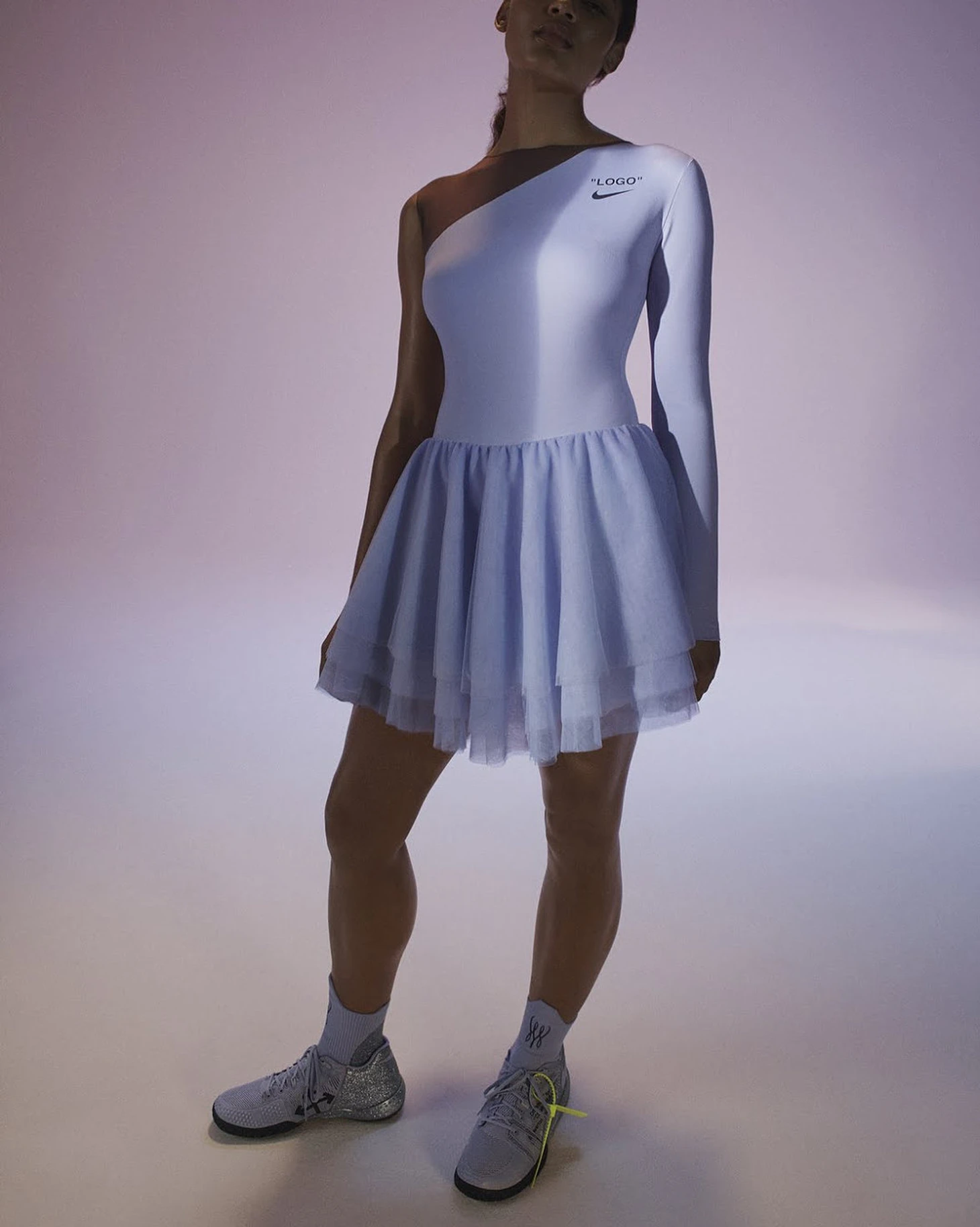 Для Серены Абло создал платье с одним рукавом и пышной юбкой из тюля: в лавандовом и черном цветах (судя по всему, на дневные и знаменитые вечерние матчи US Open). Платье оформлено самыми узнаваемыми элементами Off-White: взятым в кавычки словом Logo, совмещенным с логотипом Nike, на груди и Serena – на рукаве.
