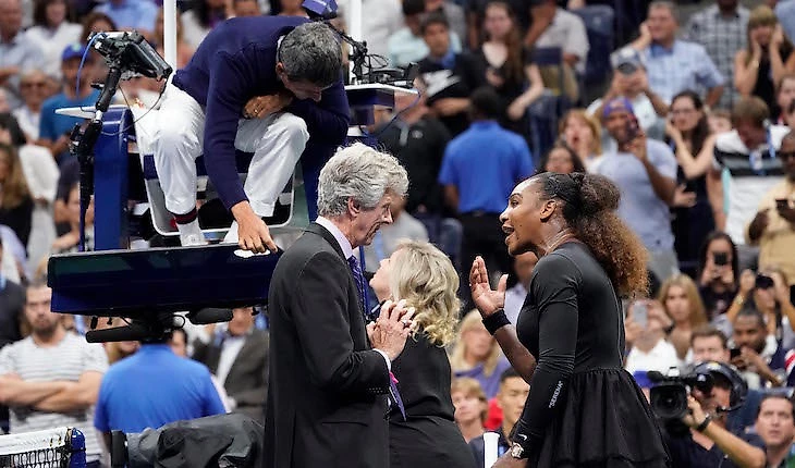 Пока Уильямс говорила это, на корт уже влетели главный судья турнира Брайан Ирли (для которого это 39-й и последний US Open) и супервайзер Донна Келсо. Пока Рамос, склонившись с вышки, объяснял ситуацию Ирли, Серена сквозь слезы доказывала Келсо, что не получала от тренера подсказок.