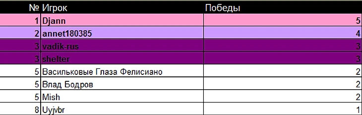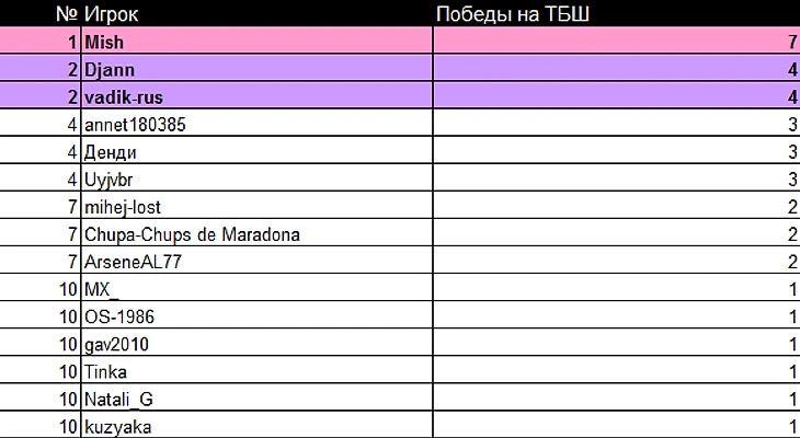 Общий зачет турниров ТБШ. Здесь мы видим, что лидирует Mish c 7 победами на турнирах ТБШ, далее идут Djann и vadik-rus с 4 победами.