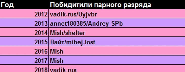 Помимо одиночного разряда, у нас проводится и парный. Давайте назовём отдельно победителей парного разряда по годам. С сезона 2016 парный турнир мы стали играть в одиночку. Победителем парного зачёта в сезоне 2018 во второй раз стал vadik-rus.