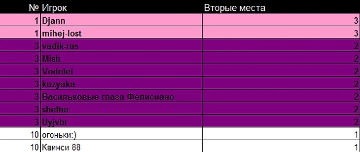 Теперь перейдём к рассмотрению вторых мест. На 1-м месте мы видим Djann, у него 3 вторых мест. С ним первое место делит mihej-lost. На 3-м месте сразу 7 игроков с скромными вторыми местами в этом сезоне.