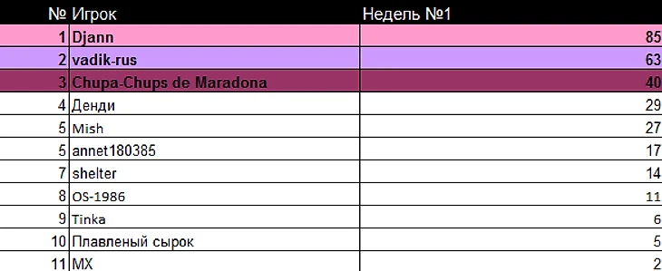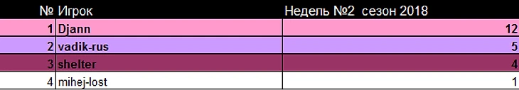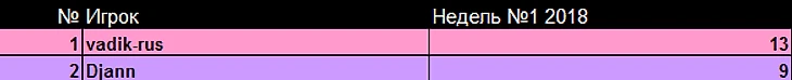 Рассмотрим таблицу, которая наглядно нам продемонстрирует, кто и сколько недель провёл на первой строчке в сезоне 2018. Несмотря на то, что в итоге vadik-rus не выиграл сезон, он лидировал большую её часть (13 недель). Djann продержался на первой строчке 9 недель.