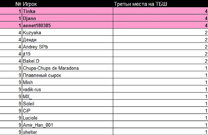 Теперь посмотрим на общею таблицу третьих мест на ТБШ