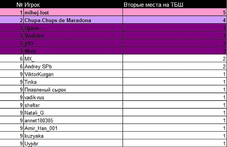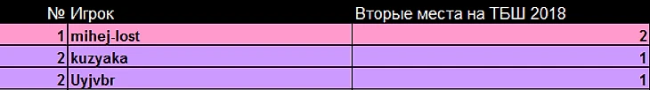 Теперь посмотрим на общею таблицу вторых мест на ТБШ