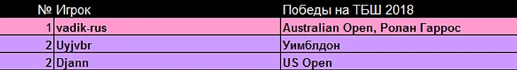 Изучив подробно информацию о том, кто побеждал, занимал вторые, третьи места, мы переходим к изучению самых важных турниров, а такими являются ТБШ. В этом сезоне не было новых победителей ТБШ. Свой 3-й ТБШ выиграл Uyjvbr. второй Уимблдон подряд. Свой 4 ТБШ выиграл Djann. Сразу два титула смог завоевать vadik-rus (для него это стали уже 3-й и 4-й ТБШ).