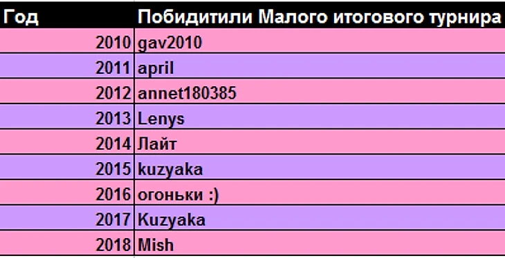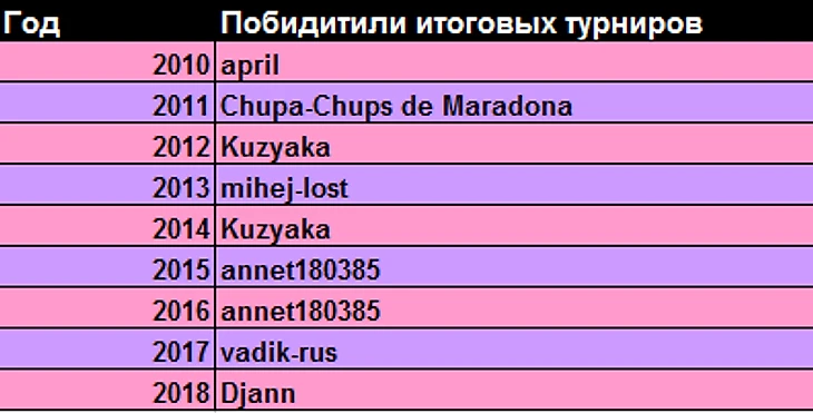 Отдельно выделим победителей итоговых турниров по годам. В этом сезоне победителем итогового турнира впервые стал Djann .