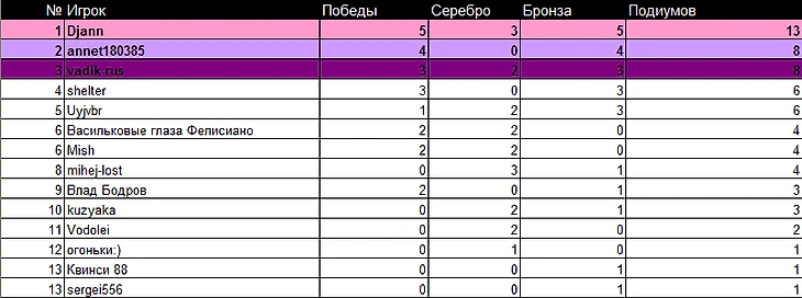 Теперь посмотрим на таблицу с общим количеством подиумов. Лидирует Djann с 13 подиумами. Следом за ним идёт annet180385 с 8 подиумами, а на 3 месте расположился Vodolei тоже c 8 подиумами, но с меньшим количеством побед. В целом 13 игроков побывали в этом сезоне на подиуме хотя бы раз.