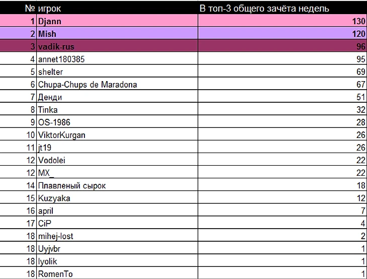 Мы видим, что Djann лидируют по количеству недель пребывания в топ-3, у него 130 недель. Также у нас в топ-3 в этом сезоне смог побывать впервые mihej-lost. Также в топ-3 побывали annet180385, shelter и vadik-rus.