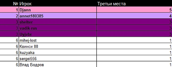 Переходим к таблице занятых третьих мест. В этом сезоне впервые в карьере 3 место занял shelter, в четвертый раз 3-е место удалось занять Djann и annet180385 (заняла третьи место дважды в этом сезоне)