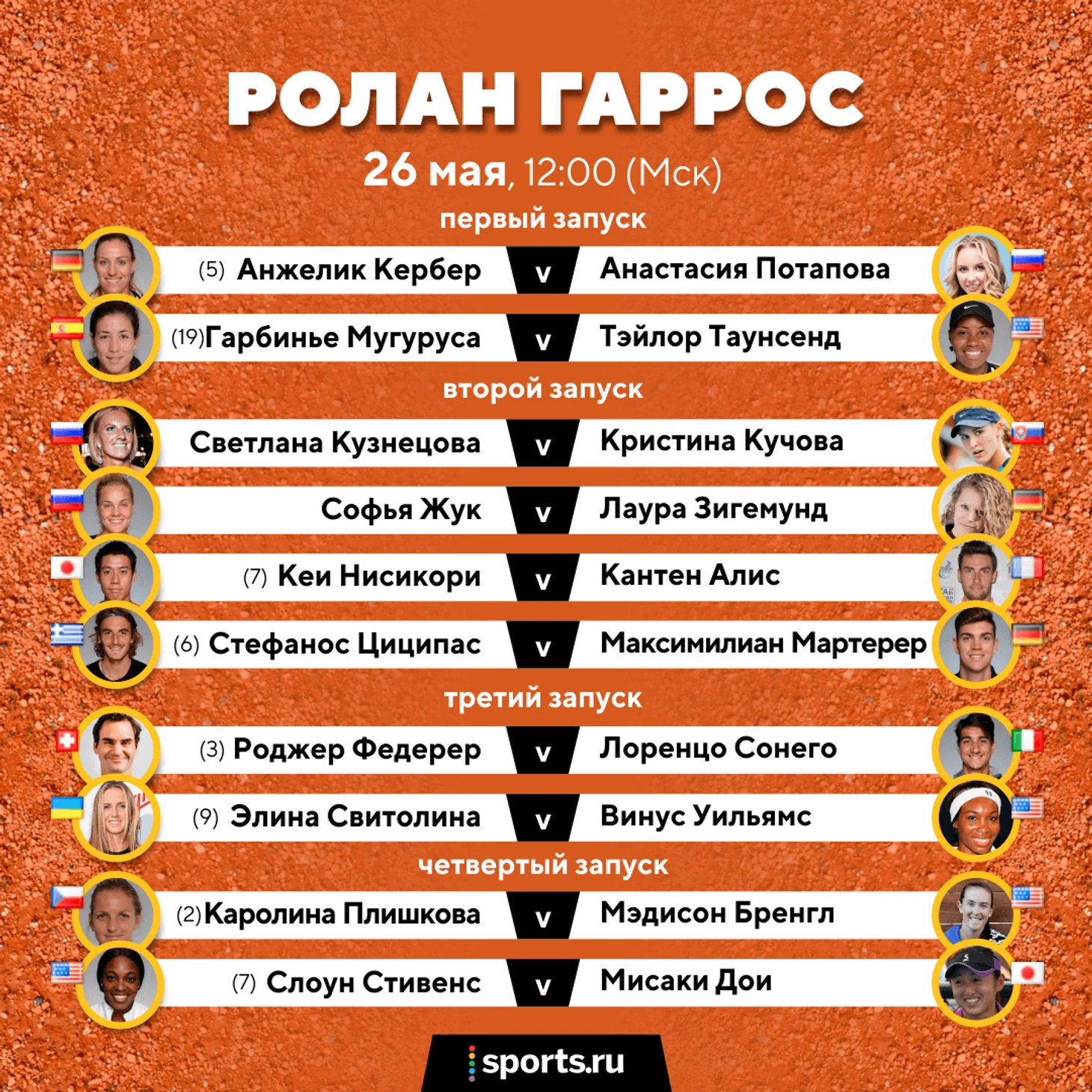 «Ролан Гаррос» наконец-то начинается. Здесь мы для вашего удобства собрали 10 главных матчей первого дня в женской и мужской сетках. Вот они в примерном хронологическом порядке.