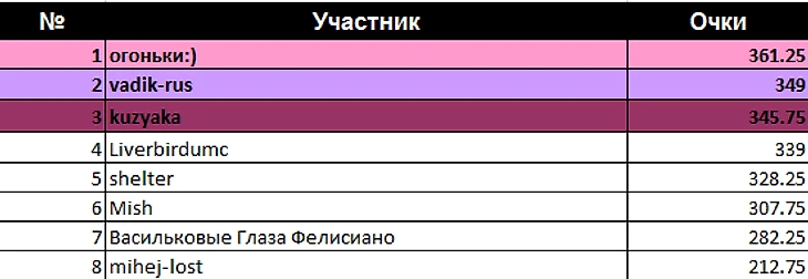 Мне очень понравилось соперничать со всеми Вами, я очень рад что заглянул к вам на огонек (ваш блог) и прописался тут))