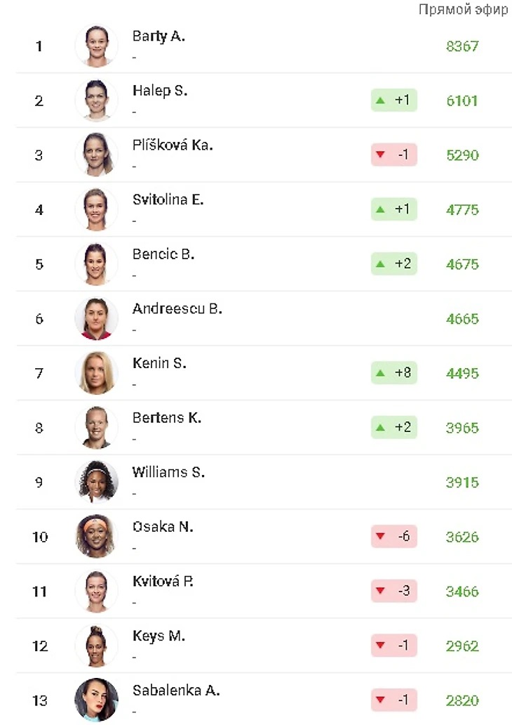 Элина Свитолина, Бьянка Андрееску и Кики Бертенс также улучшили свои результаты, завтра три спортсменки поднимутся в рейтинге. Наоми Осака серьезно потеряла в рейтинге, с четвертой строчки японка опустится аж на десятое место.