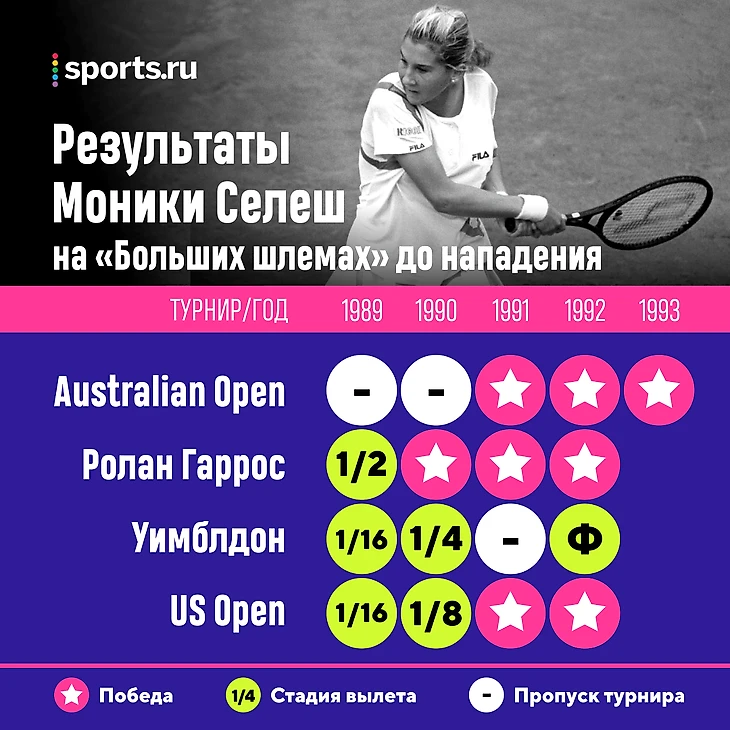Великий период ее карьеры продлился чуть больше четырех лет – с февраля 1989-го, когда она стала профи, до апреля 1993-го и нападения. За это время она выиграла восемь «Больших шлемов» из 14 проведенных, 32 титула всего и стала первой ракеткой мира. Все это еще до 20-летия. Для сравнения Граф, Шарапова и Серена из своих первых 14 «Шлемов» выиграли по одному, Винус – два, Хингис – четыре, а Крис Эверт – пять. Ближе к Селеш не подобрался никто.