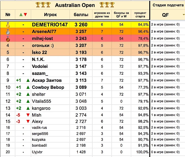Казалось бы, при таком сценарии победу должен одержать тот из владельцев Надаля, кто стоит выше сейчас, то есть нынешний лидер Деметрио. Но здесь в силу вступает тот самый нюанс, о котором мы упомянули выше. Дело в том, что по новым правилам на крупных турнирах начисляются бонусы, если победитель был в команде игрока с самого старта. Смотрим на составы и видим, что у лидера Деметрио Надаль взят на замену (вместо Берретини, что ой как добавляет истории драматизма), а у его ближайшего преследователя Арсена испанец рвет и мечет со старта! Именно поэтому здесь мы наблюдаем хитрую развилку: