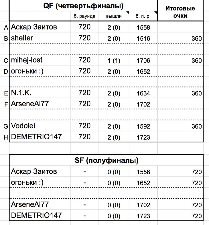 Прежде всего отмечаем, что абсолютно во всех четвертьфинальных парах победитель определялся по доп. показателям, причем в паре Михея и Огонька один выиграл по одному критерию, второй – по другому, но поскольку в приоритете количество вышедших в следующий раунд из стартового состава, победа досталась Огоньку.