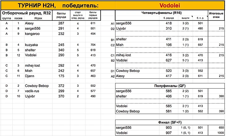 Двое лидеров сезона – Alexy и Михей – снова показали хорошие результаты, а так же вошдший в пятерку Водолей победил в турнире H2H. Причем победу ему принесла неудачная замена его соперника Сергея – взятая перед полуфиналом Бенчич уступила теннисистке категории из "Г", получила небольшой штраф, но его хватило, чтобы определить разницу. Да, у Водолея тоже были проигравшие в полуфинале, но в H2H мы учитываем минусы только в первом матче теннисиста в команде – то есть первой раунд для игроков старта и раунд выхода на замену для запасных. Удивительно, но лидеры общего зачета в H2H вылетели в первом же раунде.