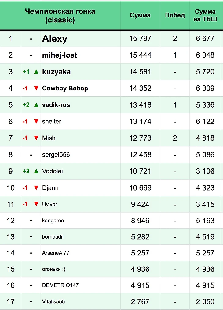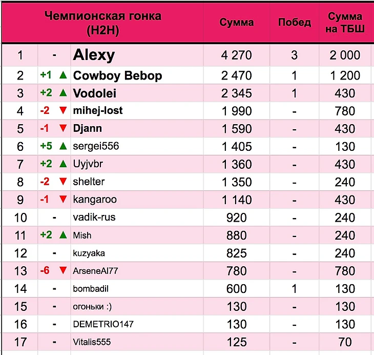 В гонке H2H до лидера Алексея еще очень далеко, а вот в тройке случились перемены: места Михея и Джанна заняли Ковбой и Водолей. Отметим также прогресс Сергея: +5 позиций.