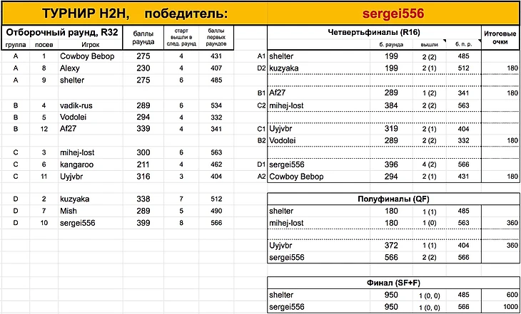 Финал H2H был выигран Сергеем у Шелтера за счет более успешных первых раундов – аж четвертого по очередности критерия, по всем предыдущим было полное равенство.
