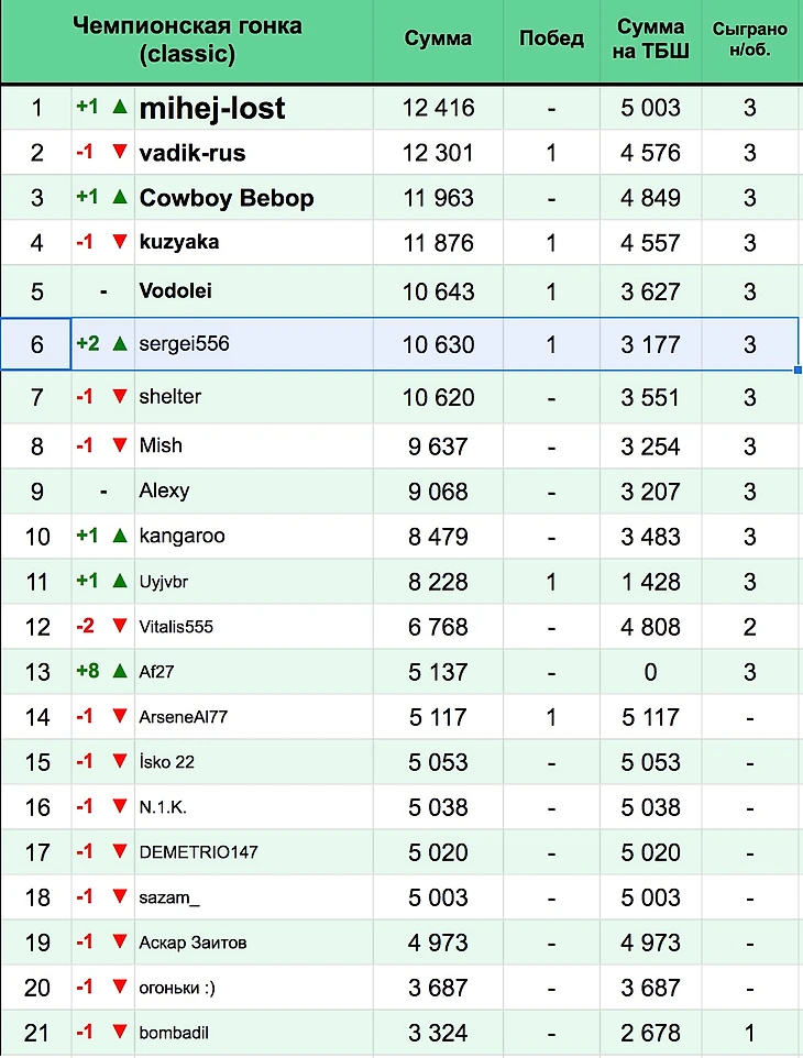 Новая смена лидера – гонку возглавляет Михей. Но плотность такая, что всё может меняться с каждым турниром. Нельзя не отметить, что еще никому не удалось выиграть более одного турнира, а из тройки лидеров победа есть только у Вадика.