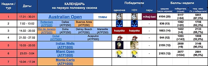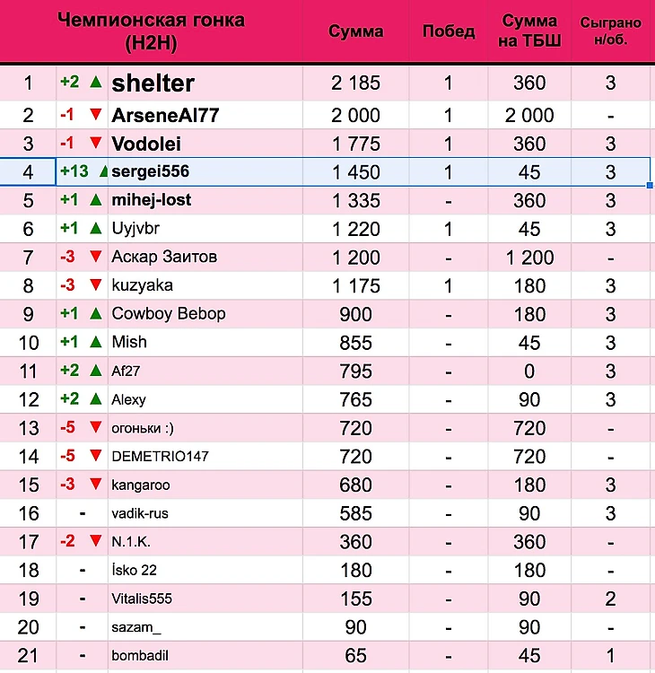 И долгожданная смена лидера в H2H – Арсена, прервавшего карьеру на взлете после победы на АО, сместил Шелтер. Отмечаем прогресс триумфатора этой недели Сергея – аж +13 позиций, браво!