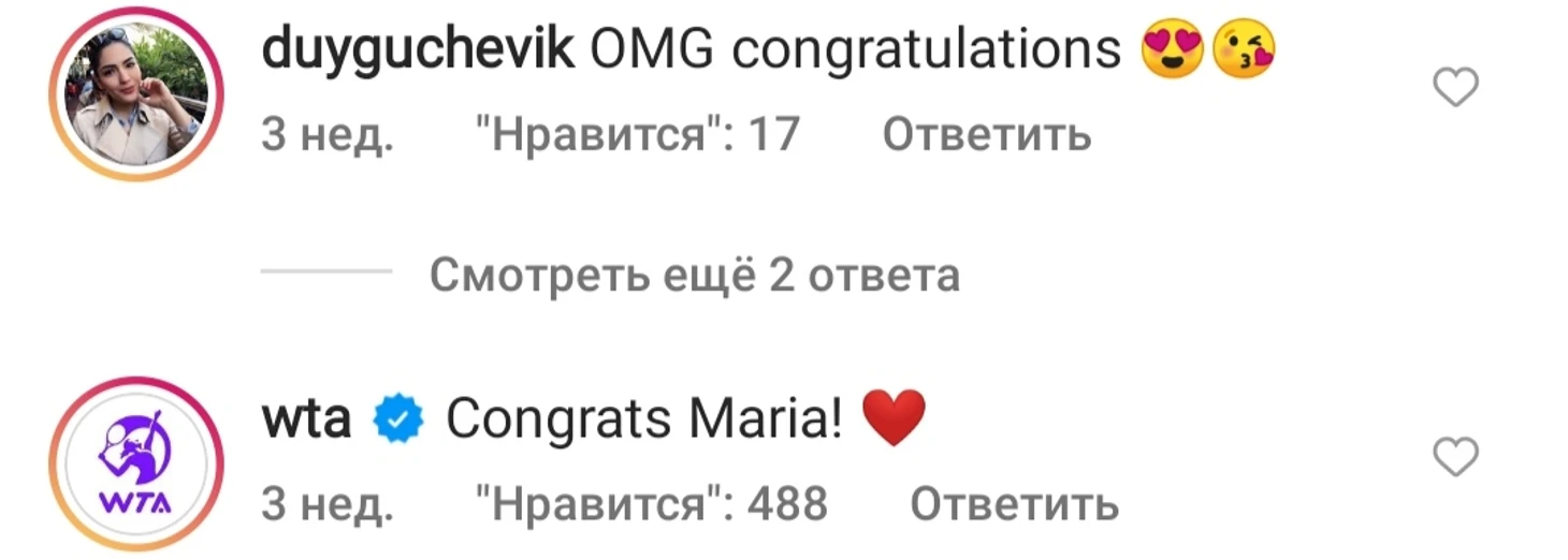 Одной из первых в комментариях появилась Женская теннисная ассоциация WTA