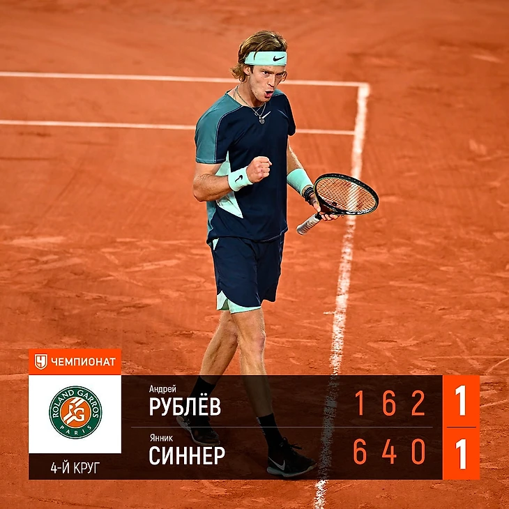 Янник Синнер мощно провёл первый сет, но затем россиянин сумел выровнять игру, а в итоге итальянец снялся из-за травмы. В следующем раунде Рублёв встретится (https://www.championat.com/tennis/news-4711183-andrej-rublyov-proshyol-v-1-4-rolan-garros-yannik-sinner-otkazalsya-prodolzhat-match.html) с победителем пары Медведев — Чилич