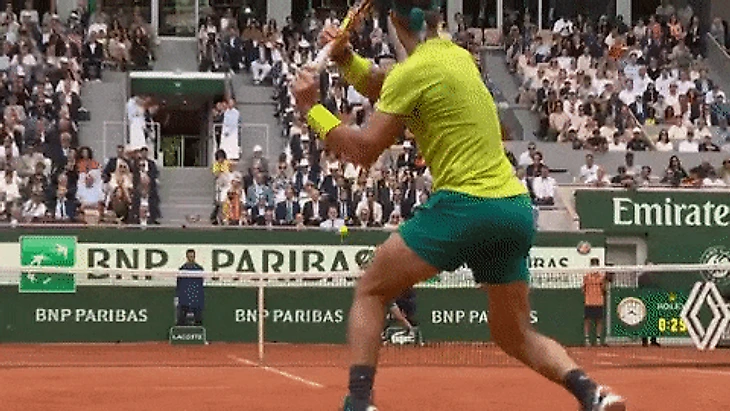 Но третий геймбол Надаль реализовал красиво: широко и глубоко выбил соперника, укоротил с форхенда, а потом обвел.