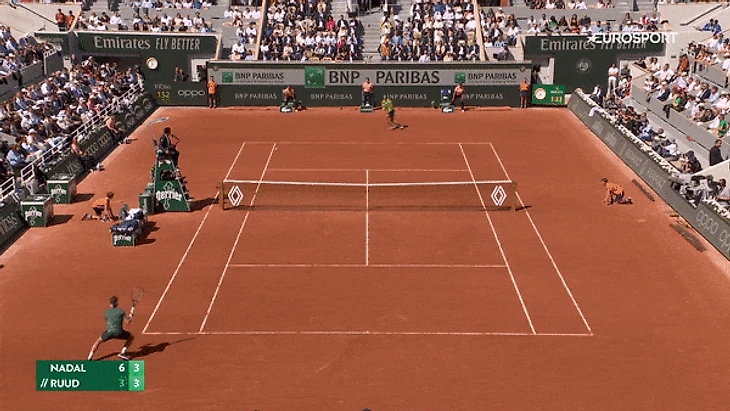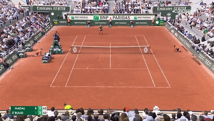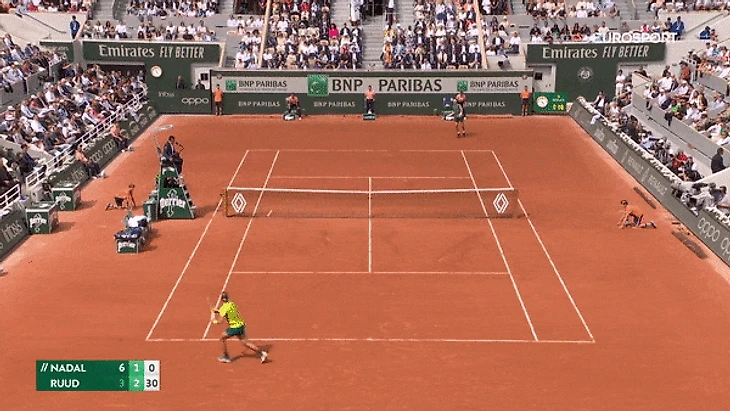 Потом Рафа забил еще бэкхенд навылет, но при счете 40:0 Рууд сыграл очень классно – догнал непростой дропшот и очень тонко и косо перевел навылет.