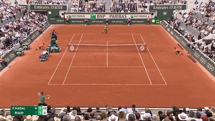 15:15 – Рууд атаковал с форхенда, но Надаль нейтрализовал очень глубоким бэкхендом (прямо в заднюю линию), перехватил инициативу и выжал ошибку.