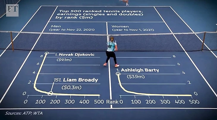 Как вы можете видеть на диаграмме выше, в теннисе существует один из самых чрезмерных уровней неравенства среди любых видов спорта. Игроки с высокими рейтингами, как мужчины, так и женщины, могут заработать значительные призовые деньги, в то время как игроки в диапазоне с рейтингом от 200 до 2 000 почти ничего не зарабатывают.