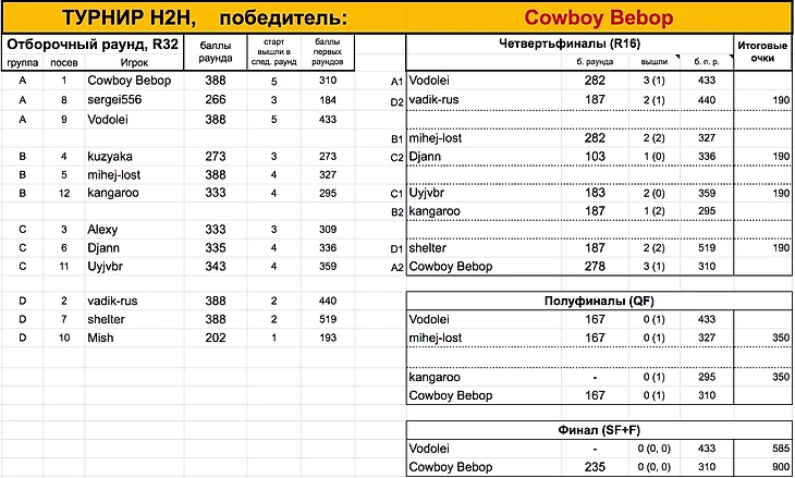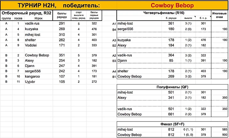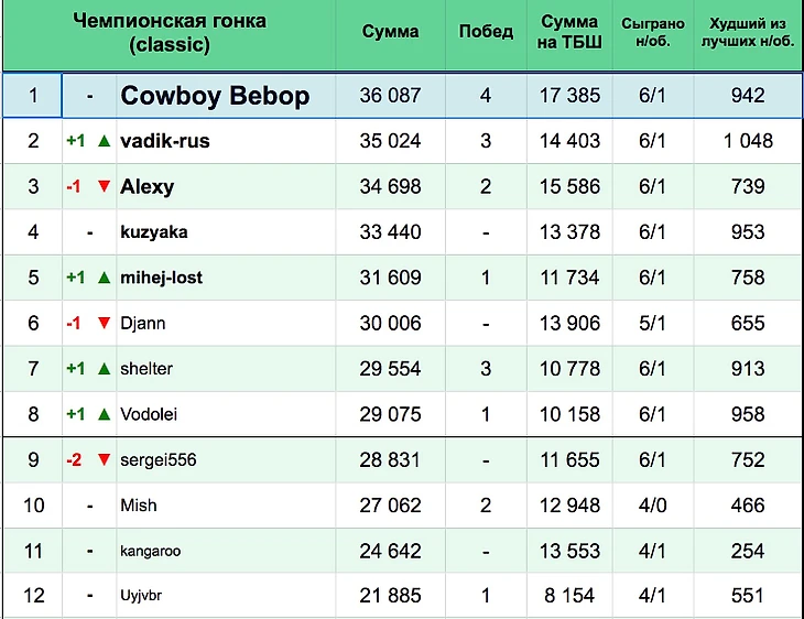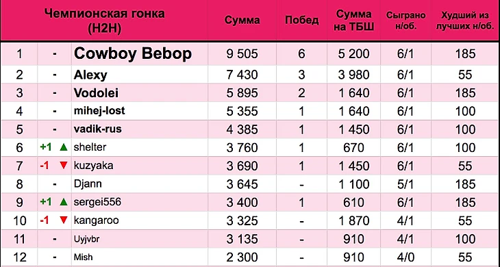 Ковбой Бибоп уходит в отрыв (уже 1000+), Вадик и Алексей меняются местами. В конце сезона самое время обратить внимание на восьмерку, за право сыграть на итоговом. По итогам этих двух турниров в топ-8 вошел Водолей.