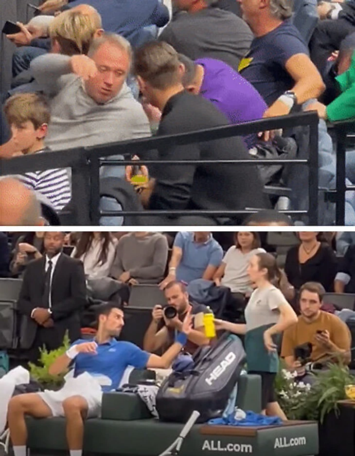 По ходу полуфинала «Мастерса» в Париже на трибунах сняли немного странное видео. Физиотерапевт Новака Джоковича, сидя в ложе серба, смешивал ему какую-то добавку – а когда команда серба заметила, что их снимают, двое мужчин чуть обнялись, чтобы прикрыть происходящее.